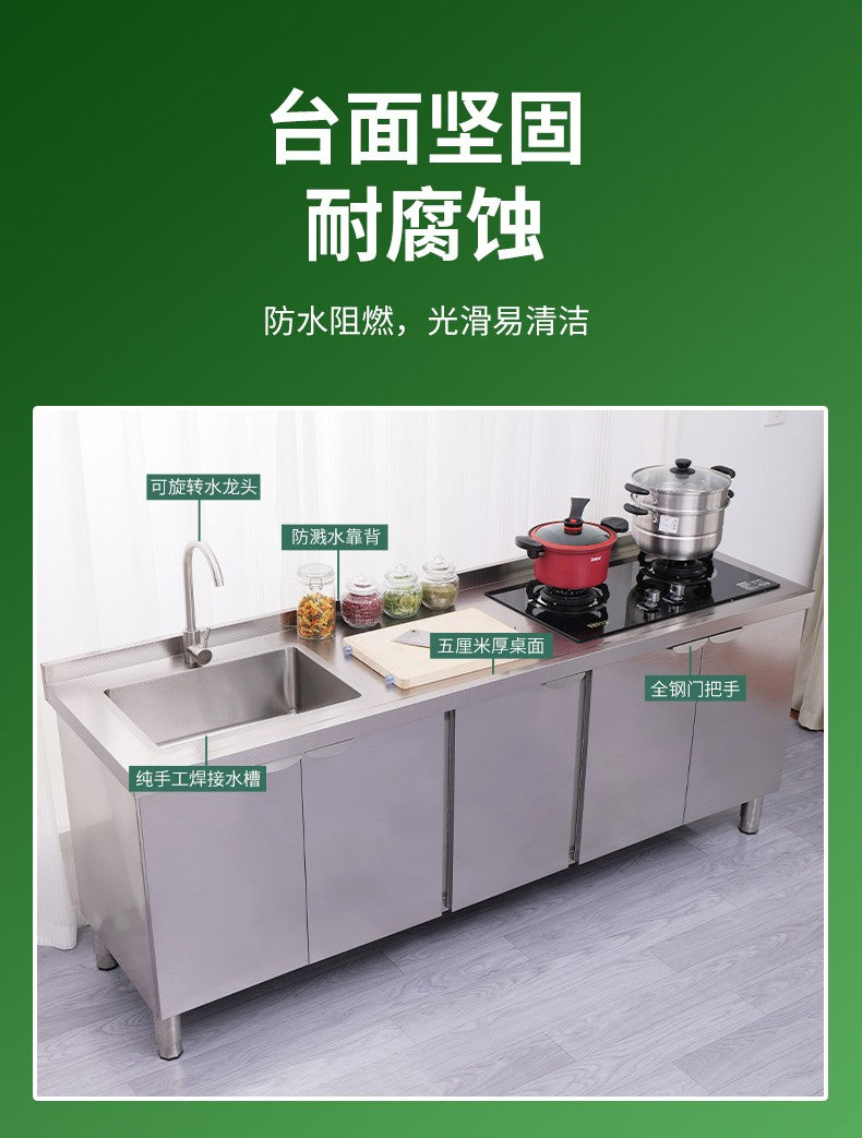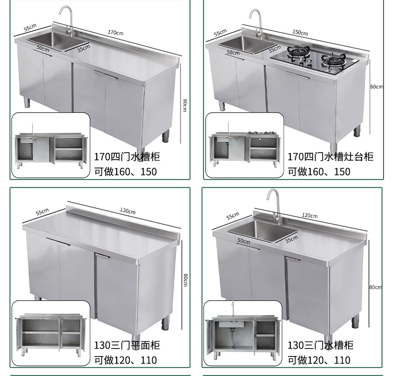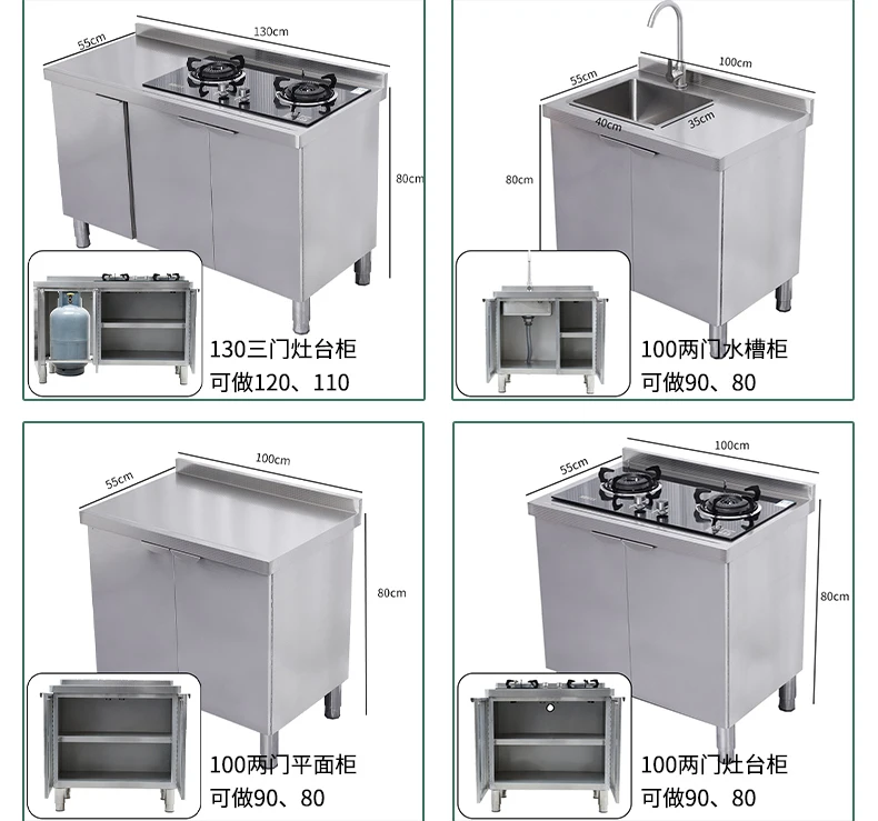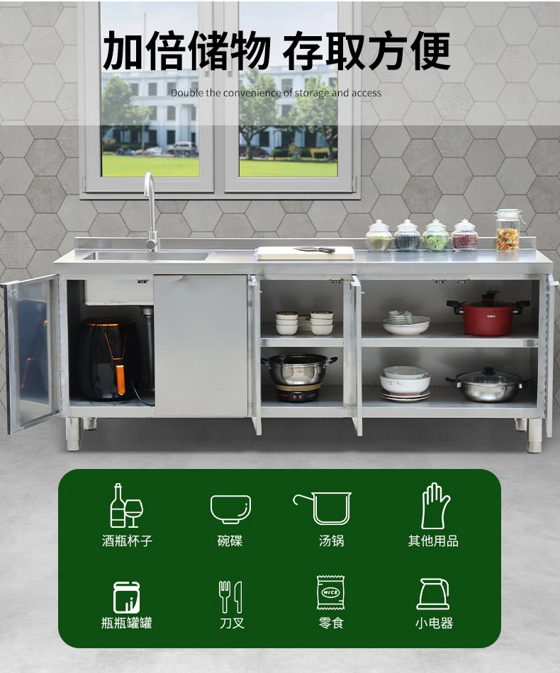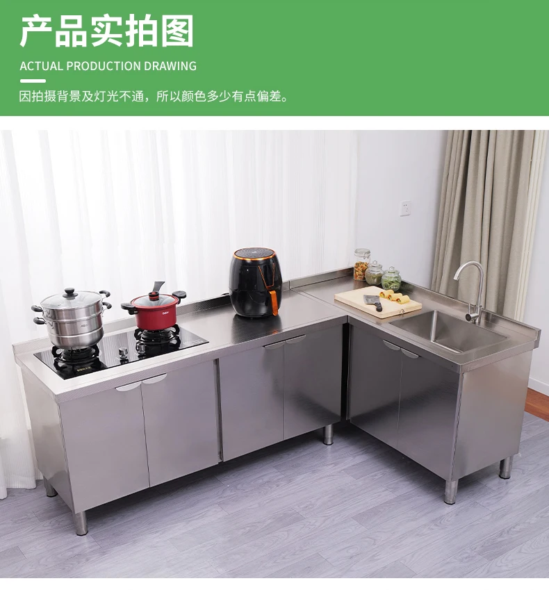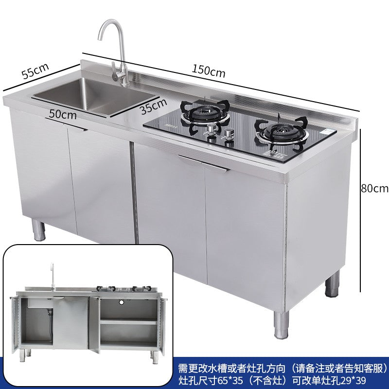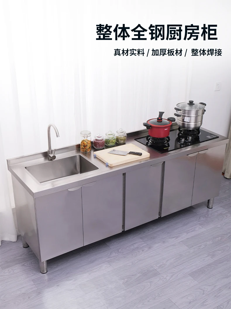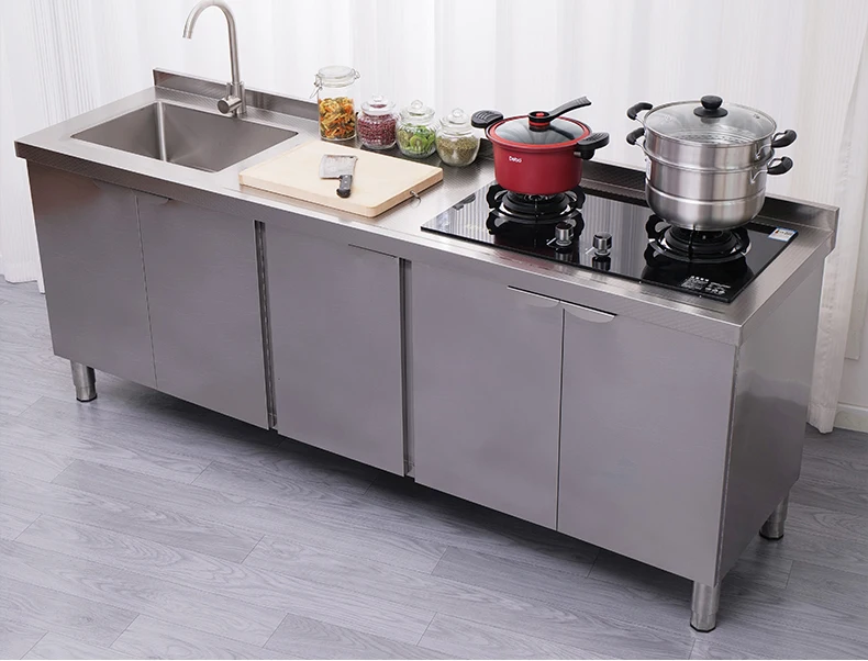 Armário de pia de aço inoxidável integrado de cozinha, armário, fogão, mesa