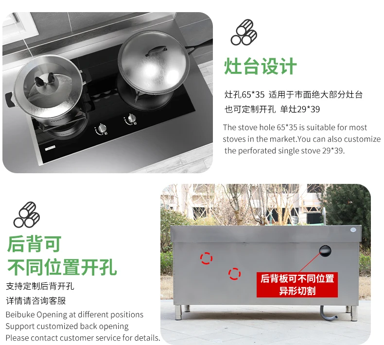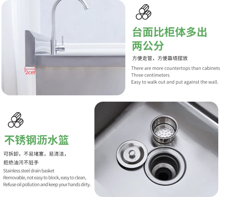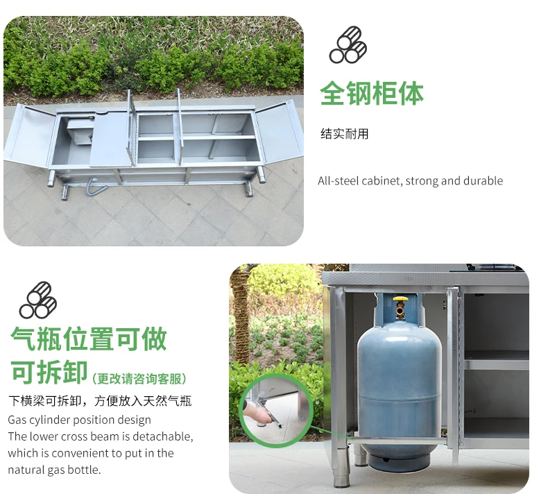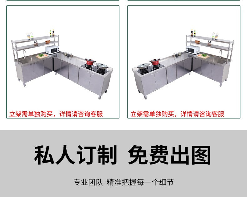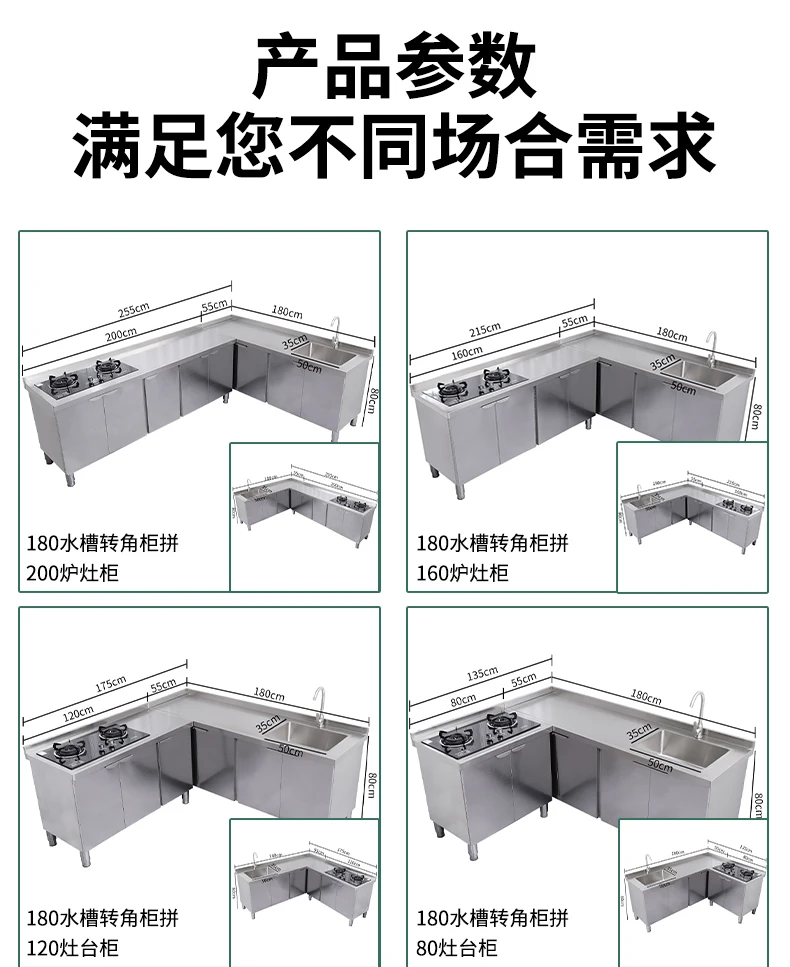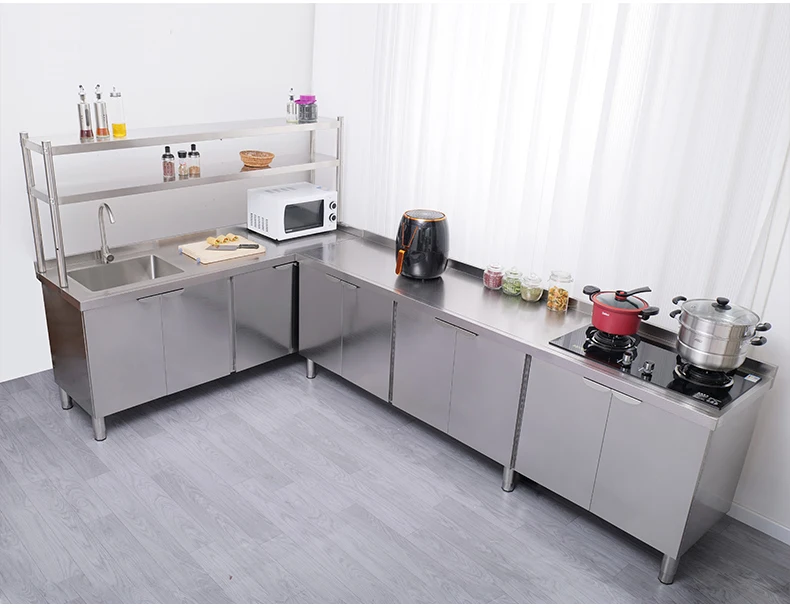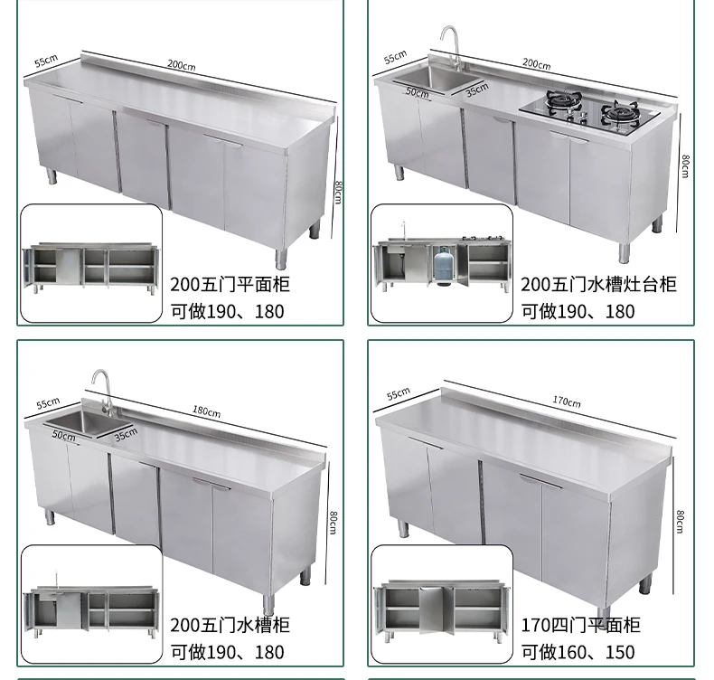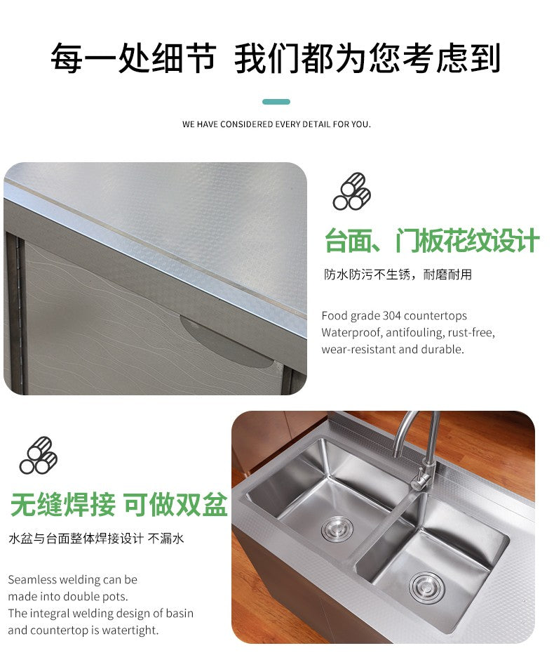 Armário de pia de aço inoxidável integrado de cozinha, armário, fogão, mesa