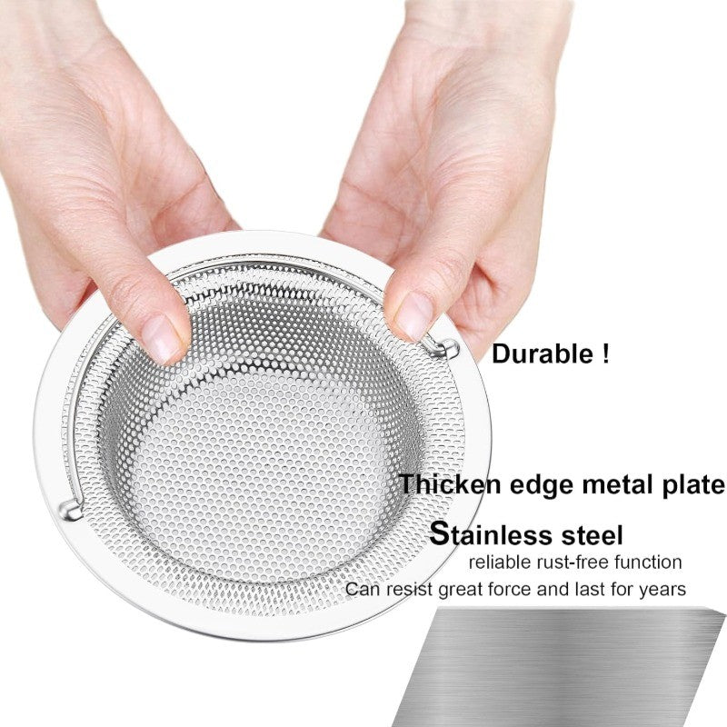 ?Projeto de segurança?O filtro de drenagem da pia é feito de metal de aço inoxidável com bordas enroladas ao redor para que possa proteger melhor suas mãos de arestas vivas cortantes em suas mãos.O material é duro e não se deforma facilmente.