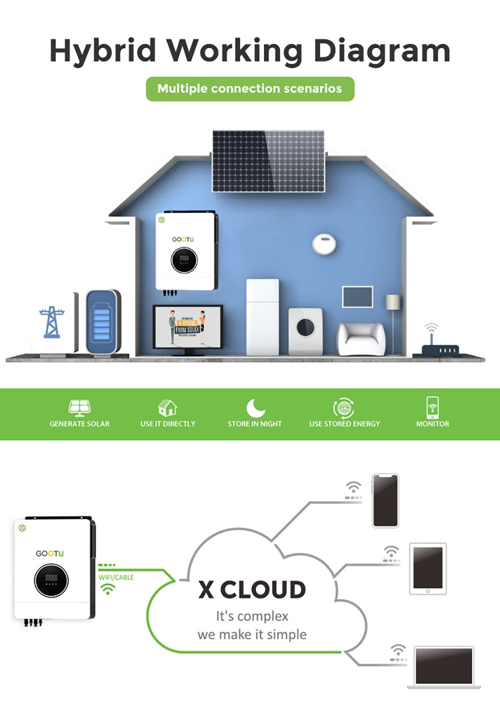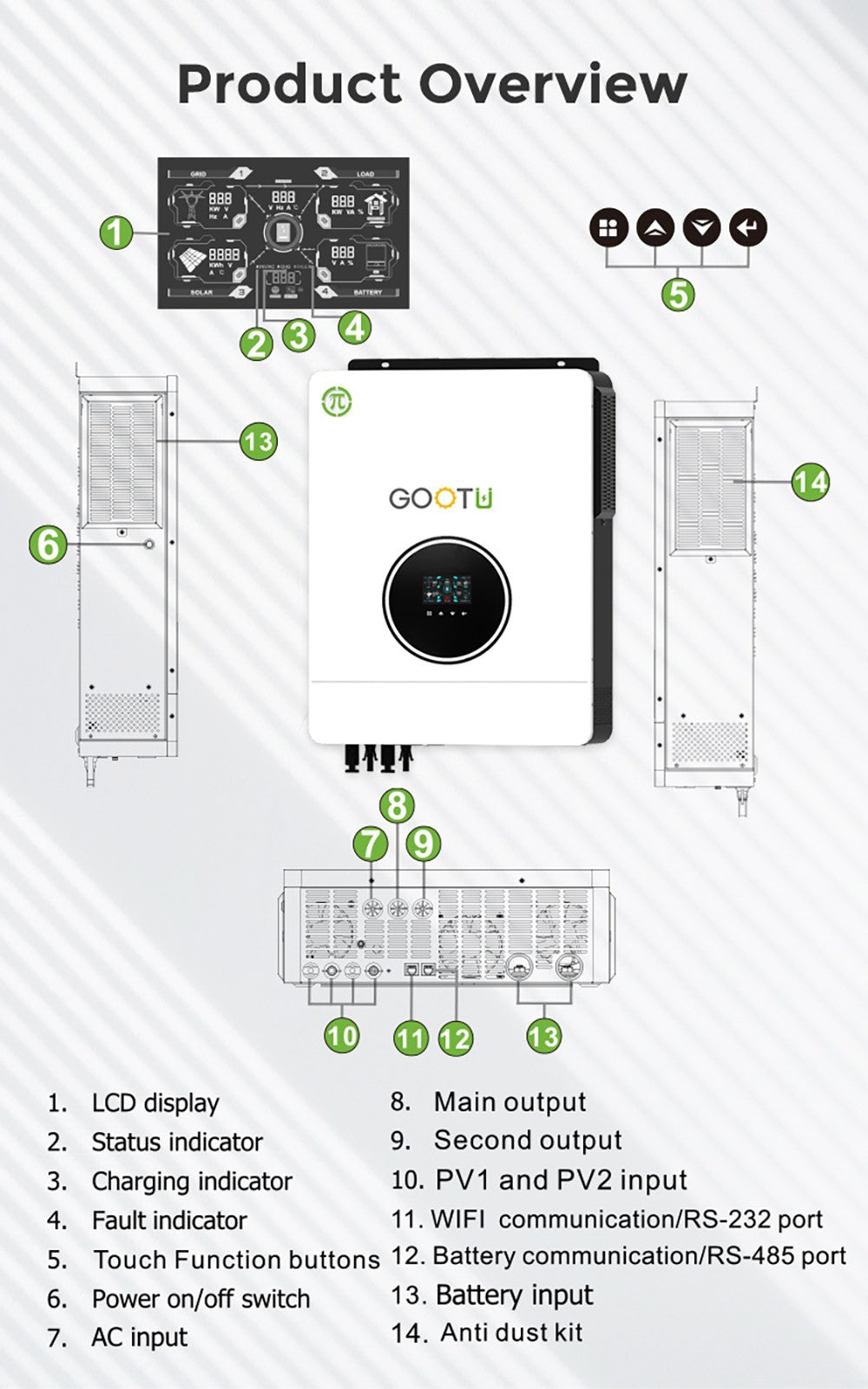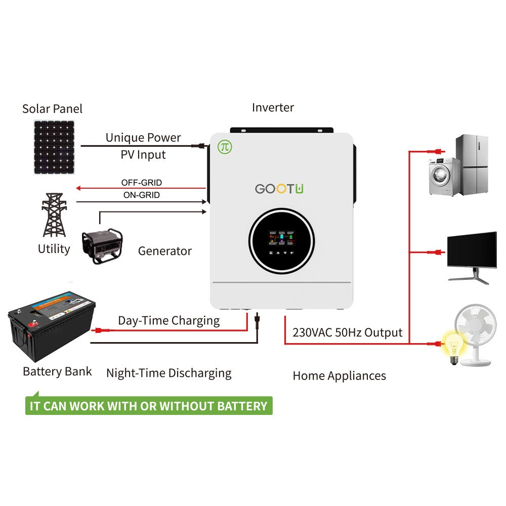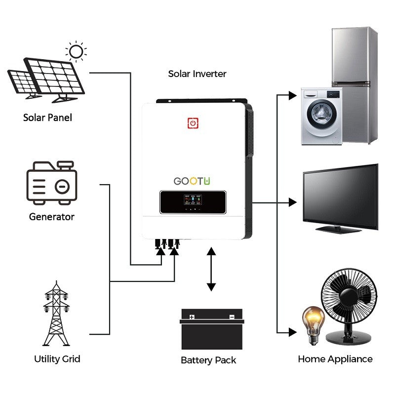 O inversor solar híbrido de saída dupla GOOTU é um tipo de inversor solar que possui duas saídas CA separadas.Isso permite que o inversor seja usado em uma variedade de aplicações diferentes, como alimentar dois edifícios separados ou alimentar uma casa e um gerador de reserva simultaneamente.O recurso de saída dupla também permite maior flexibilidade no projeto do sistema, pois pode ser usado para otimizar a produção e distribuição de energia.Os inversores solares de saída dupla são comumente usados em instalações solares residenciais e comerciais maiores.