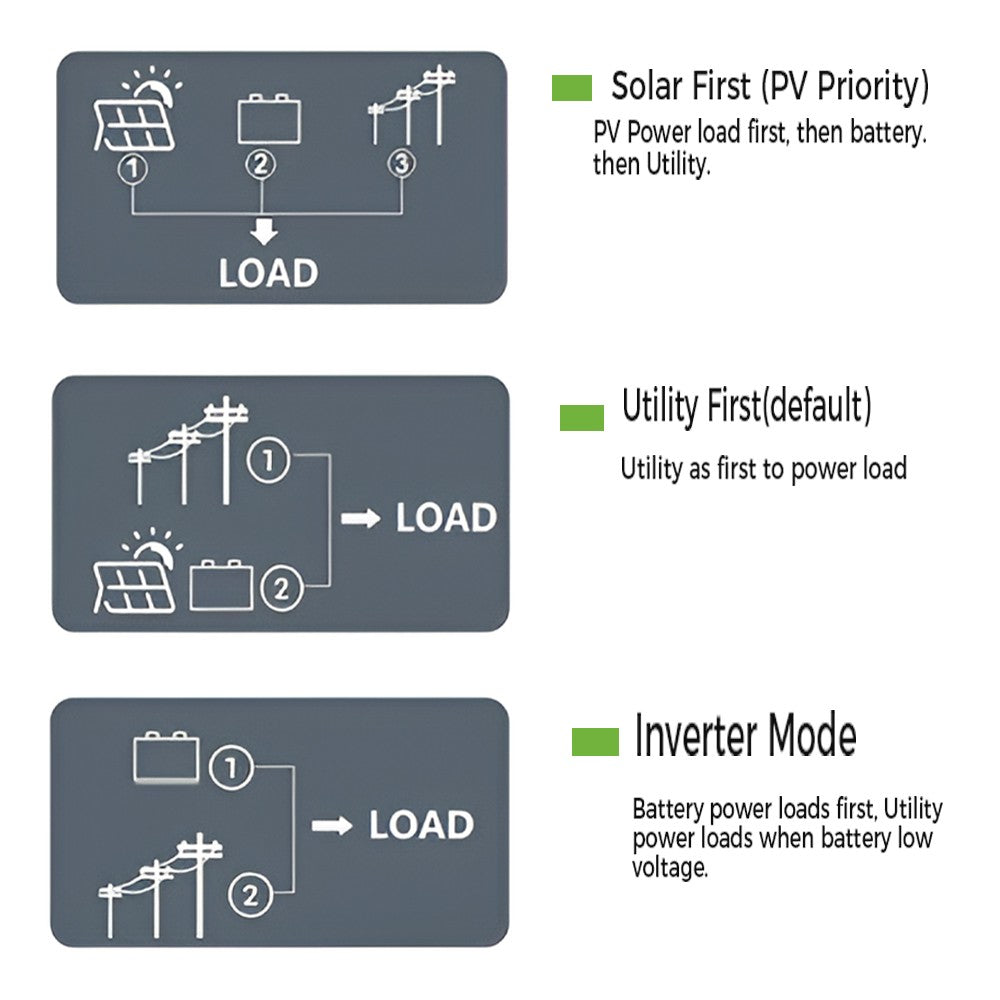 2.Utilidade em primeiro lugar: Use a rede elétrica para carregar a bateria primeiro e use energia solar apenas quando não houver rede elétrica.