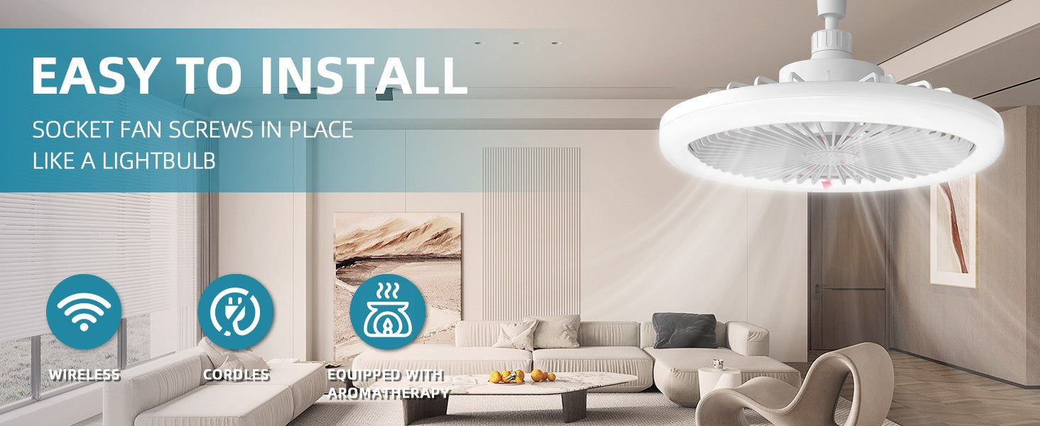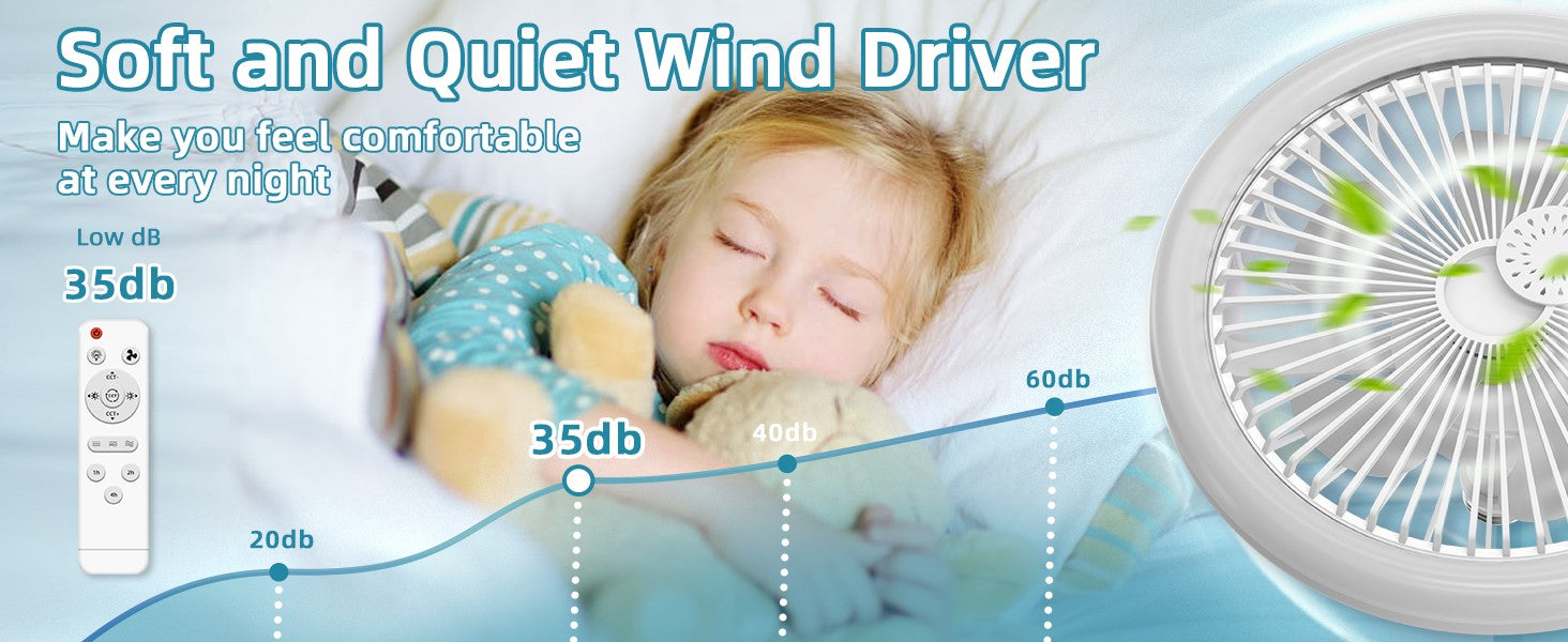 Perfil Discreto e Seguro: Com dimensões compactas (25x25x12CM), o ventilador de 5 lâminas e o corpo em ABS é mais seguro do que luminárias de teto tradicionais e oferece um design de cabeça universal para ajuste de direção.