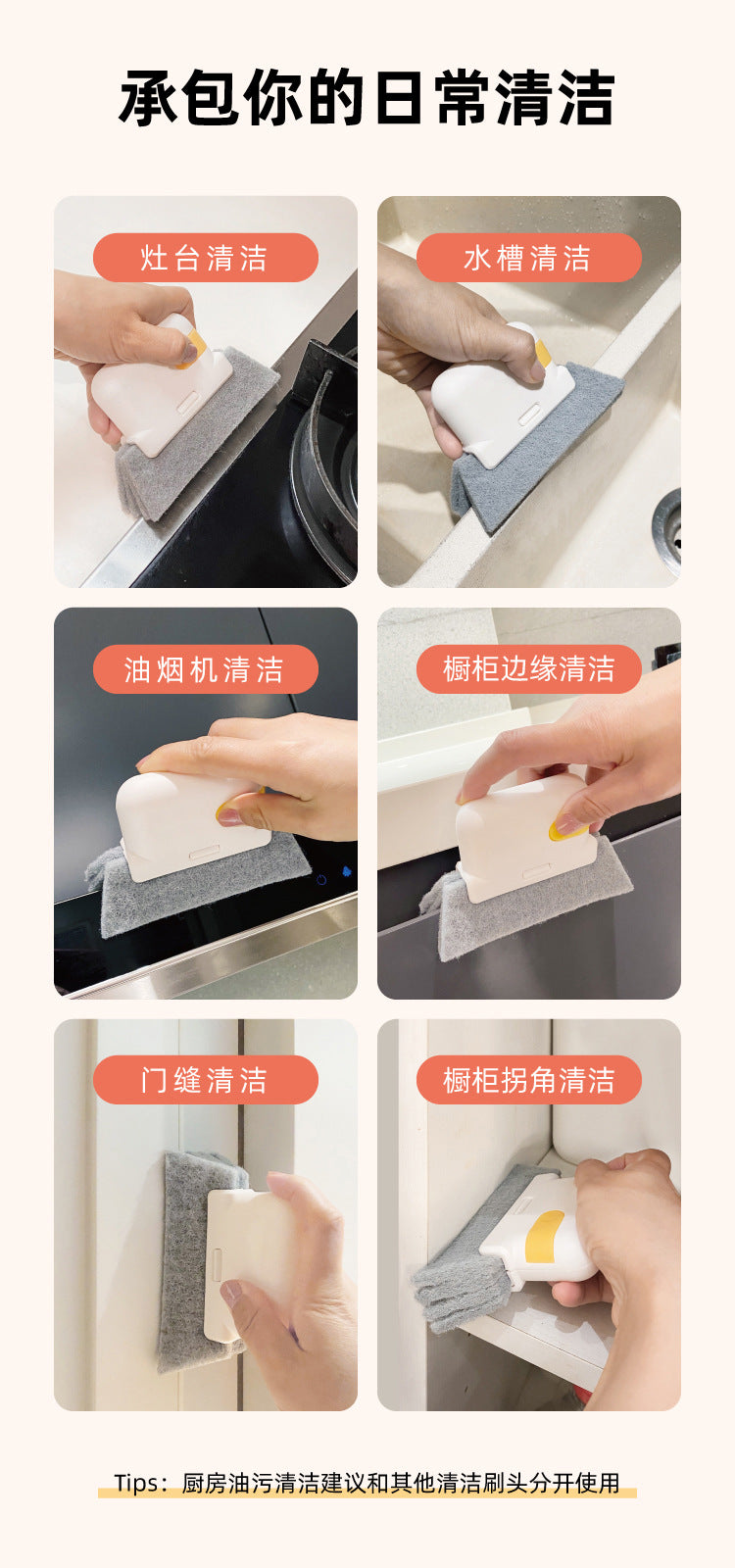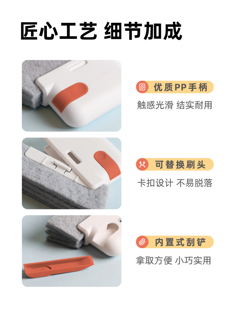 1.Alça de material PP, cabeça de escova de limpeza, bom poder de limpeza, pode limpar os corrediças e lacunas das portas e janelas, etc., conveniente e sem esforço.