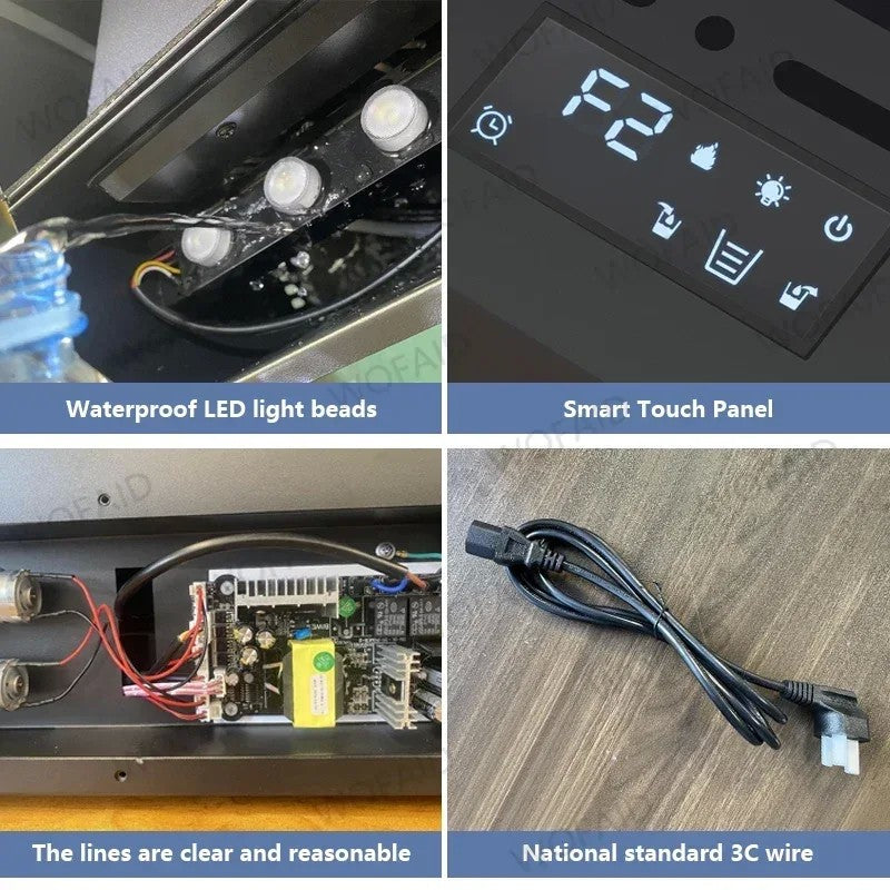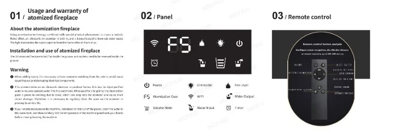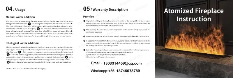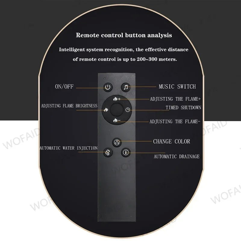 A lareira a vapor de água tem função de entrada e saída automática de água.quando a água estiver cheia, ela interromperá automaticamente o enchimento de água e começará a funcionar, quando a água não for suficiente, ela irá parar de funcionar automaticamente.O tempo de trabalho pode ser definido diretamente pelo APP remoto ou móvel.