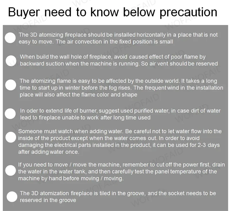 A lareira de vapor de água suporta a função de umidificação interna, adicionando aromaterapia ou poucos desinfetantes na água para tornar o ar fresco e a desinfecção em nosso espaço residencial.