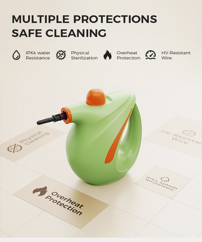 Esterilização 99,99%: Alcance uma temperatura de vapor de 105°C que elimina bactérias, ácaros e germes sem a necessidade de detergentes ou produtos químicos, tornando-o totalmente seguro para o uso em áreas com crianças e animais de estimação.