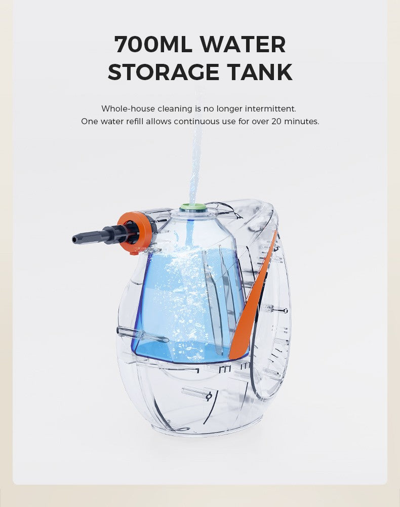 Limpeza Contínua Prolongada: Seu tanque grande de 700ml permite mais de 20 minutos de limpeza contínua com um único enchimento. O design transparente permite que você verifique o nível da água facilmente.