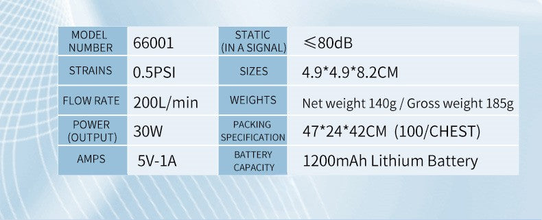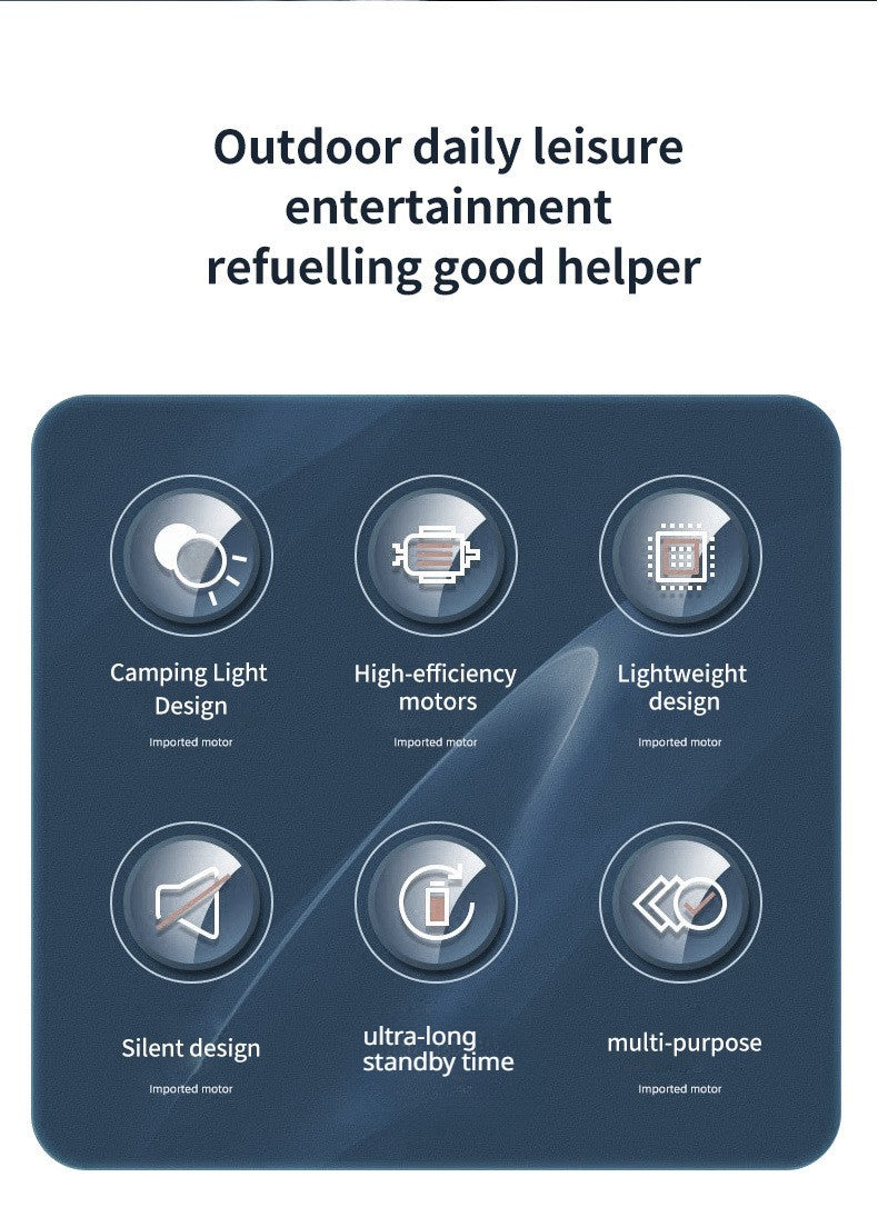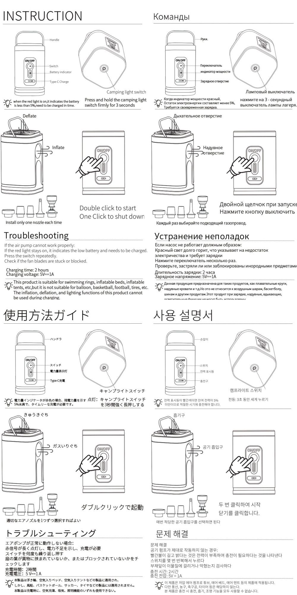 1. quando a luz vermelha está acesa, indica que a bateria é inferior a 5%, precisa ser carregada a tempo.2. pressione e segure o interruptor da luz de acampamento firmemente por 3 segundos, ligue as luzes de acampamento ?3. clique duas vezes para iniciar a bomba de ar, um clique para desligar a bomba de ar ?4.Solução de problemasSe a bomba de ar não funcionar corretamente: se a luz vermelha permanecer acesa, indica bateria fraca e precisa ser carregada. Pressione o interruptor repetidamente. Verifique se as pás do ventilador estão presas ou bloqueadas.