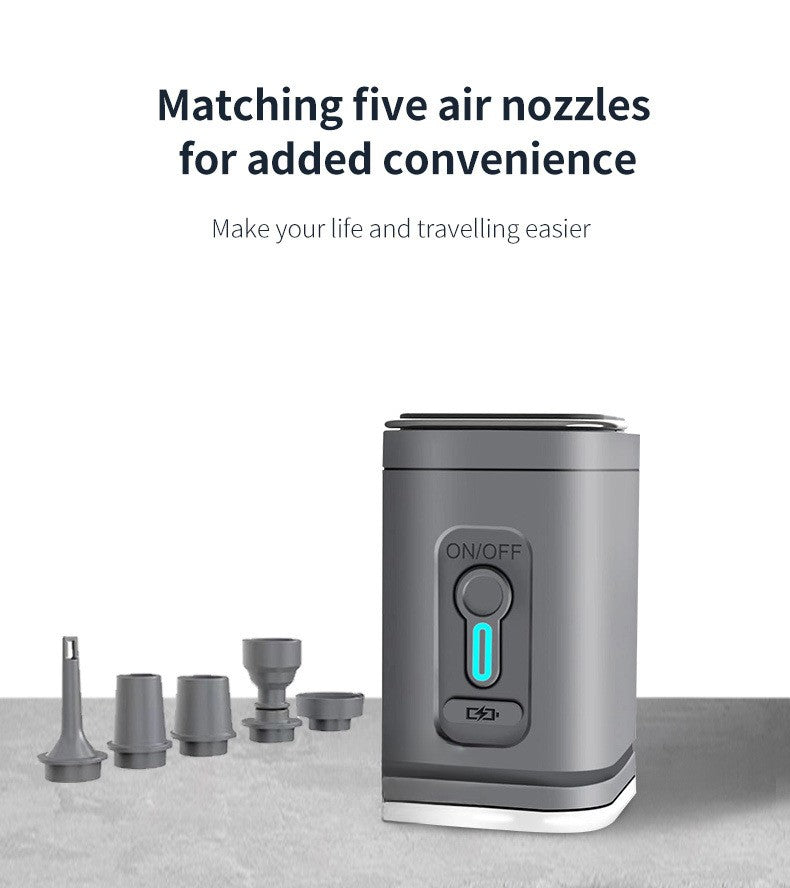 Esta bomba de ar é versátil, adequada para inflar flutuadores de piscina, camas de ar e sacos de armazenamento a vácuo.