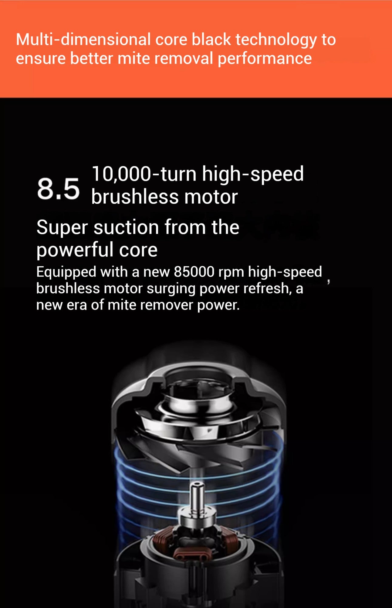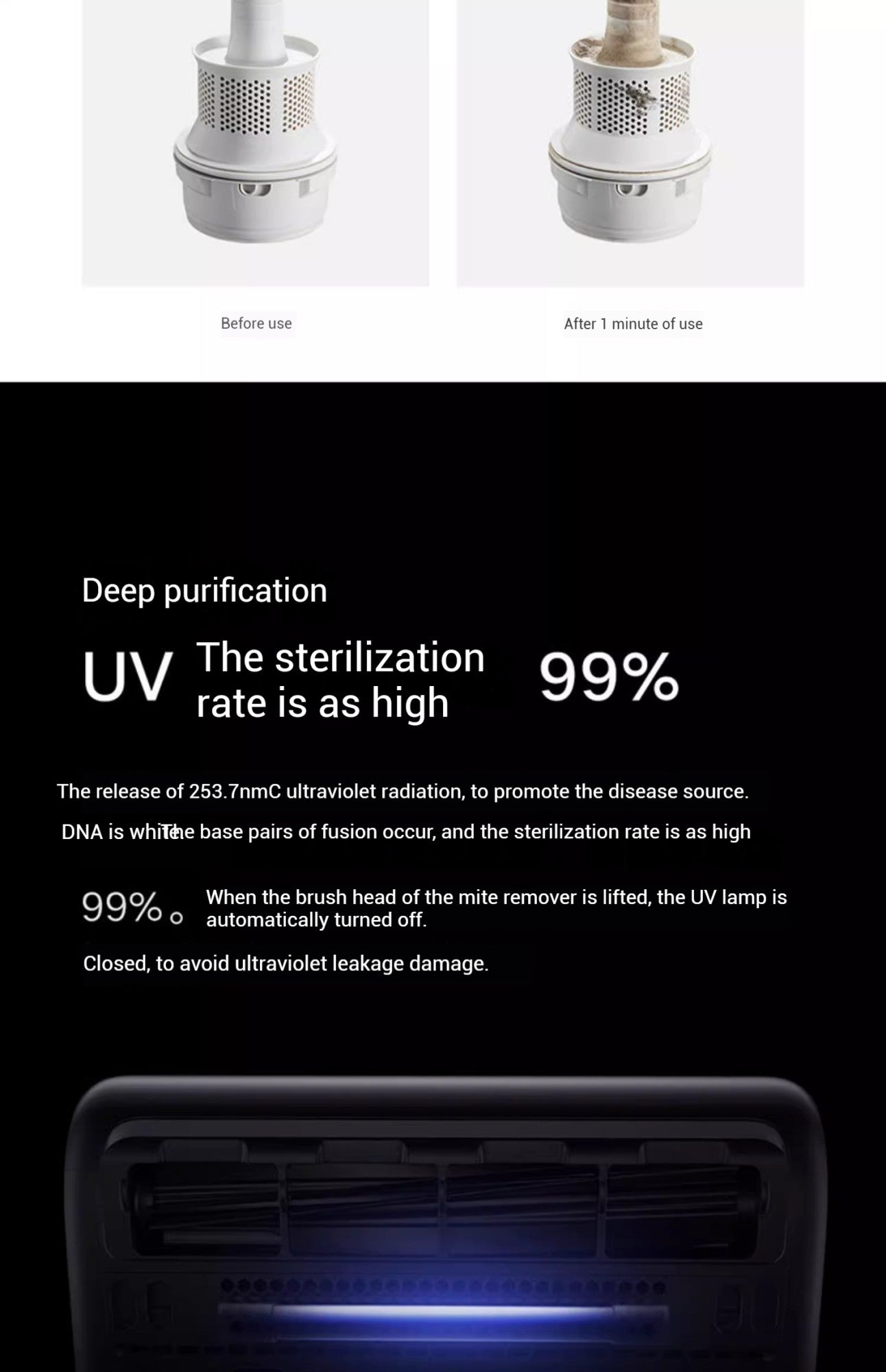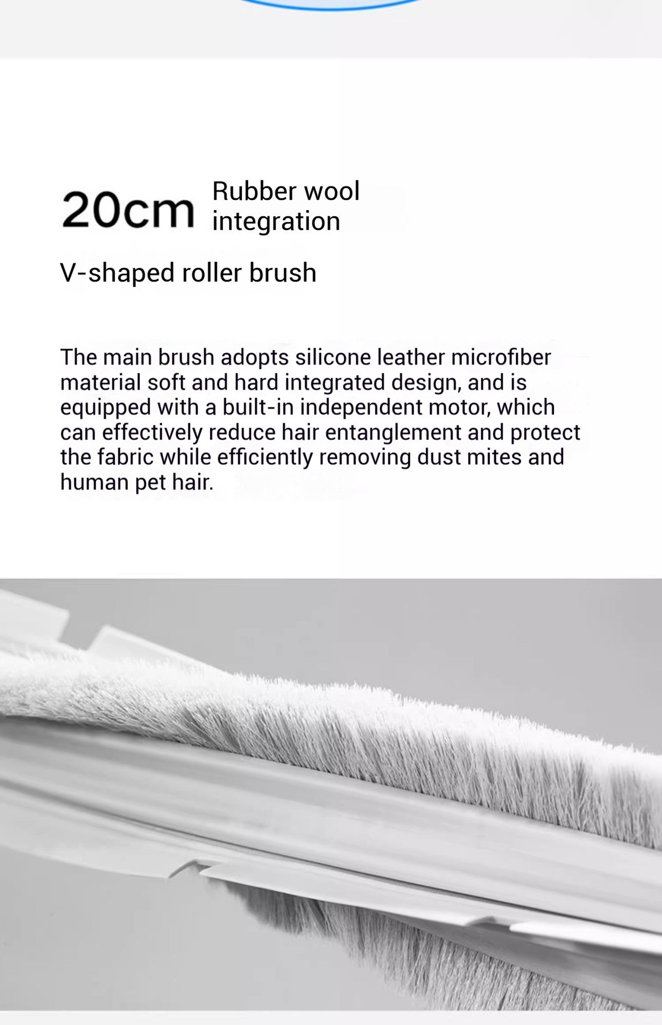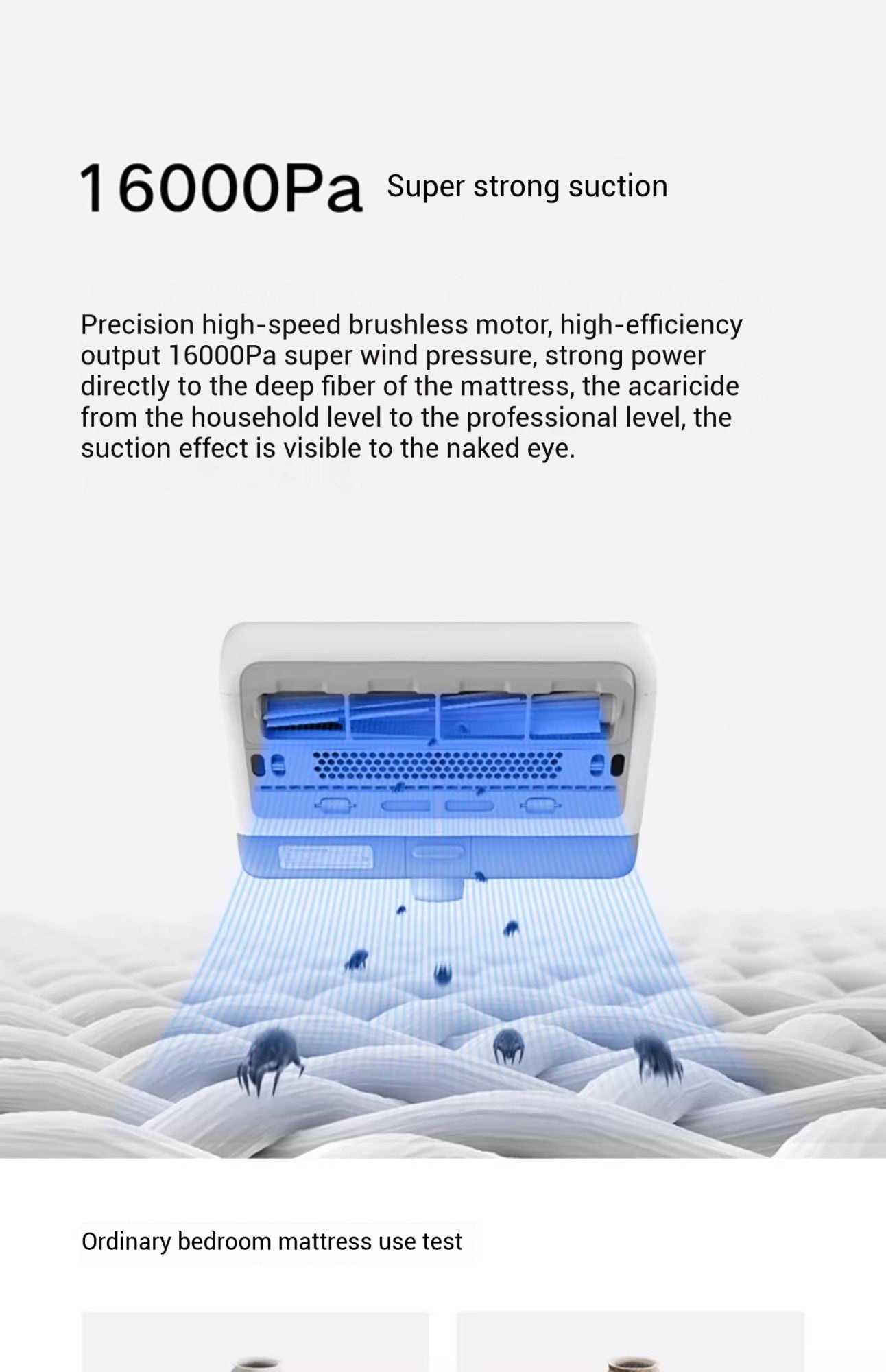 Potência Profunda: Equipado com 16KPa de sucção, ele remove eficientemente ácaros, pó, pelos e escamas de pele alojadas nas fibras do tecido.