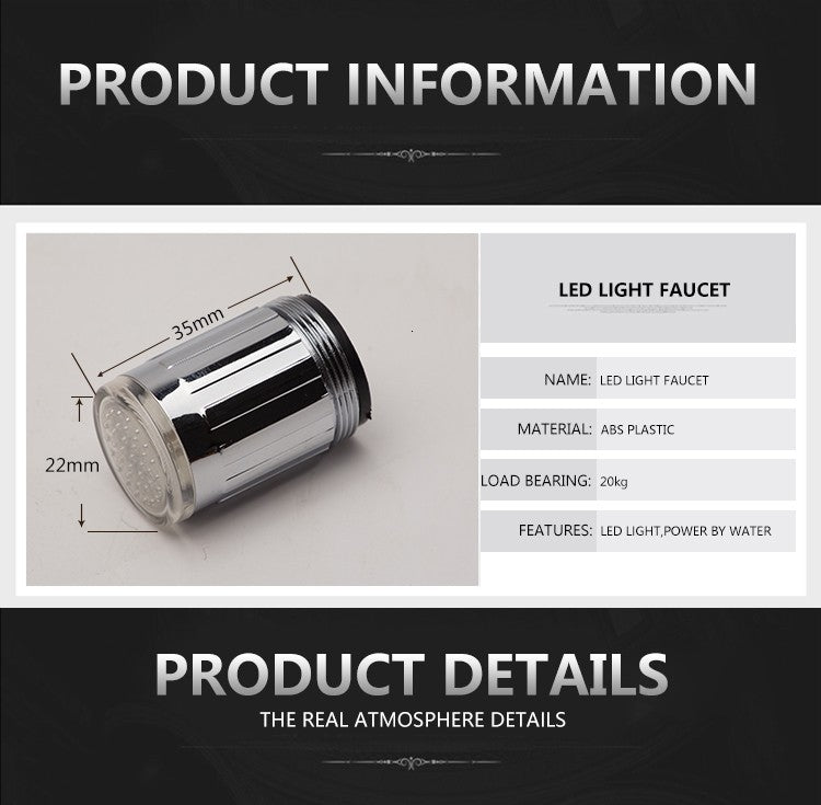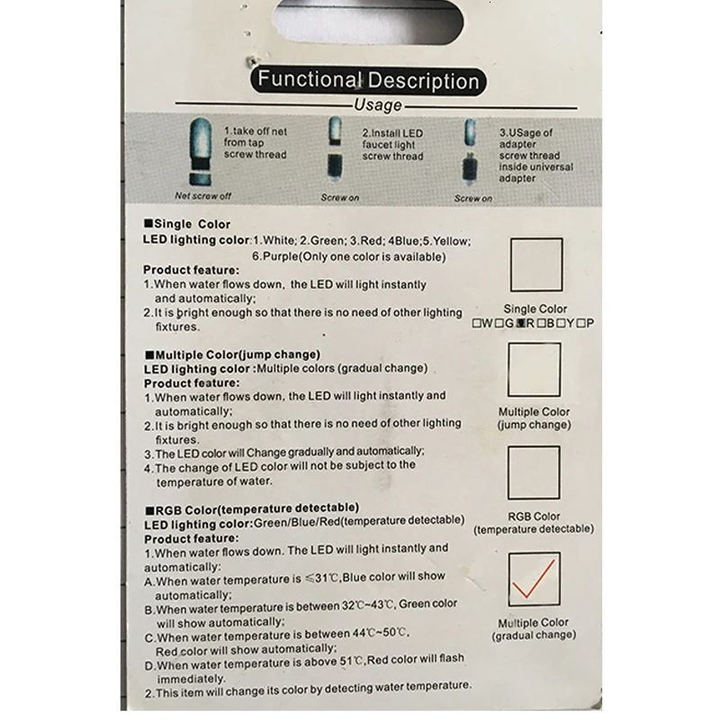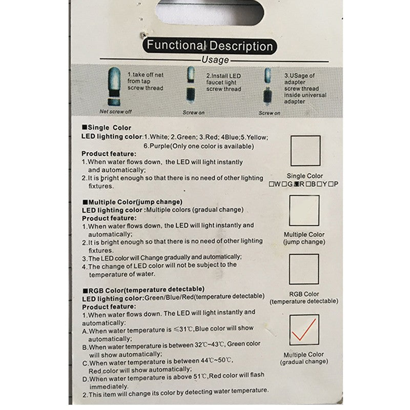 Multi-cor: 7 cores, desde que o fluxo de água dê luz, a cor pisca e muda aleatoriamente.
